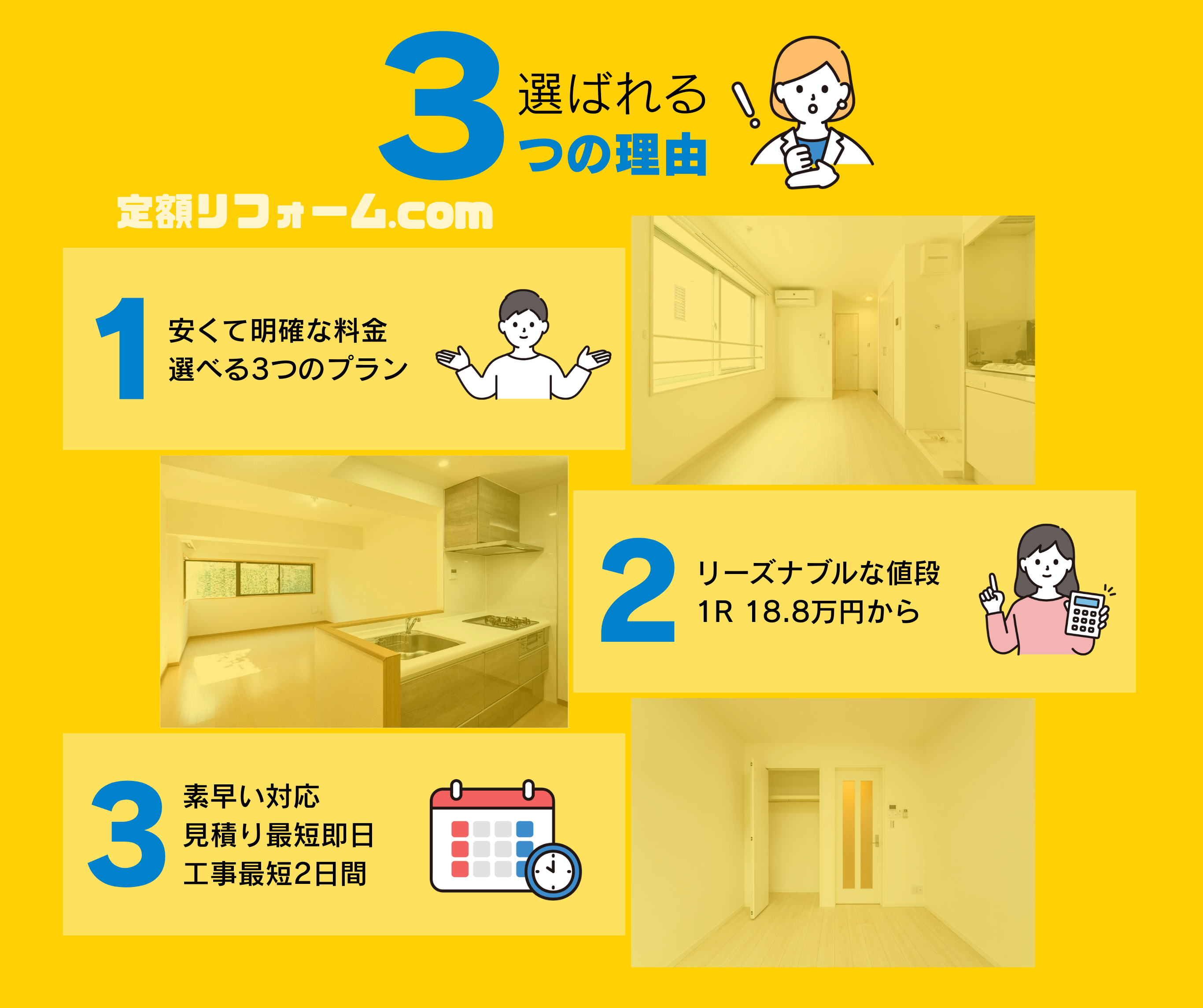 急ぎにも対応、分かりやすい料金体系、激安リフォーム、原状回復、アパートマンション、投資用物件、簡単